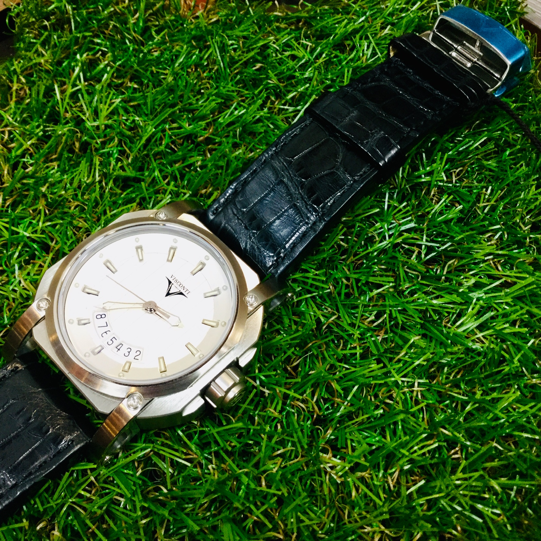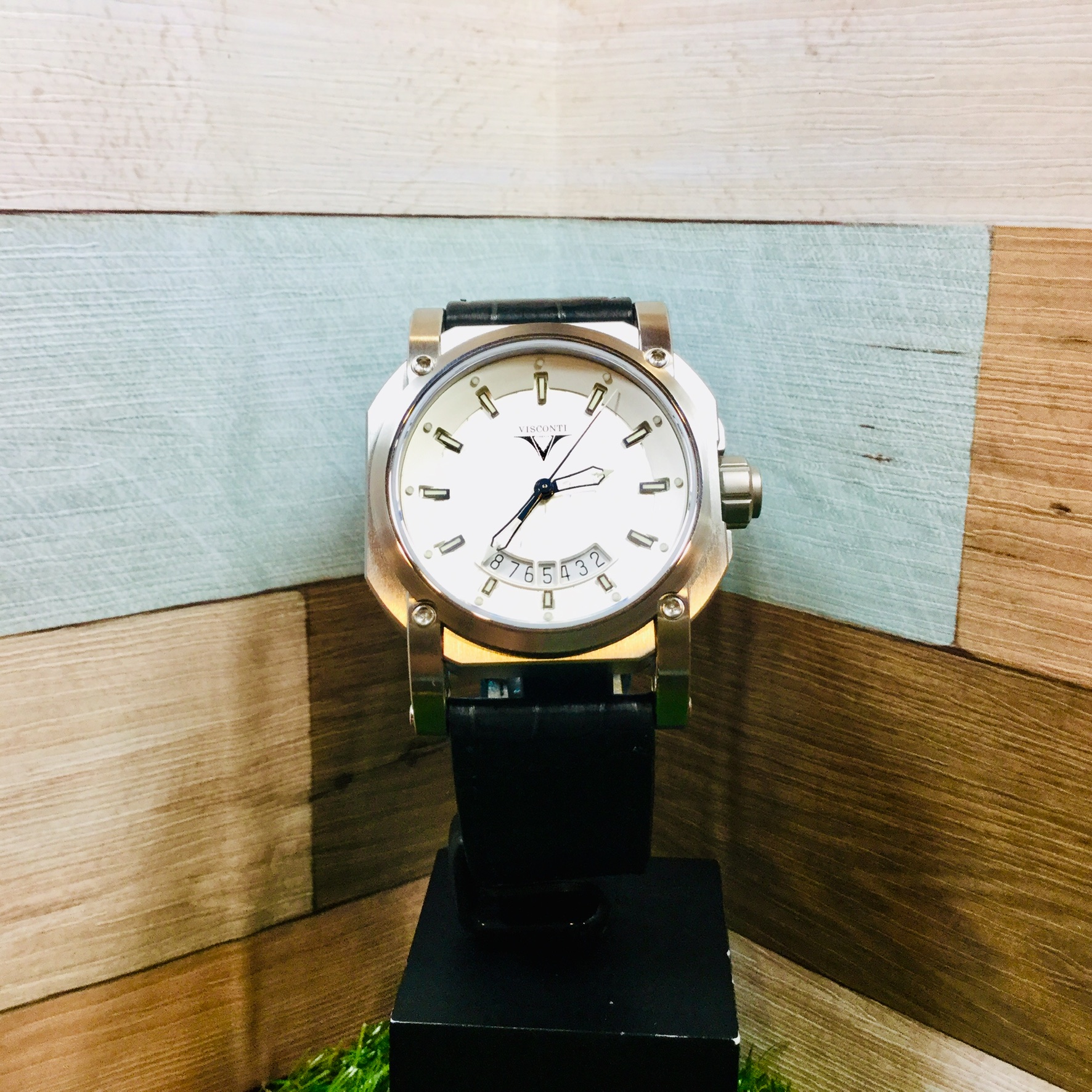 VISCONTI Elegance 2Squared Up To Date エレガンス 2スクエアード アップ トゥ デイト Ref:W101-01-101-010ケース径:47mm ケース厚:15.2mm ケース素材:SS 防水性:100気圧 ストラップ:レザー ムーブメント:自動巻き、Cal.Spprod SOP A10-2 仕様:日付表示